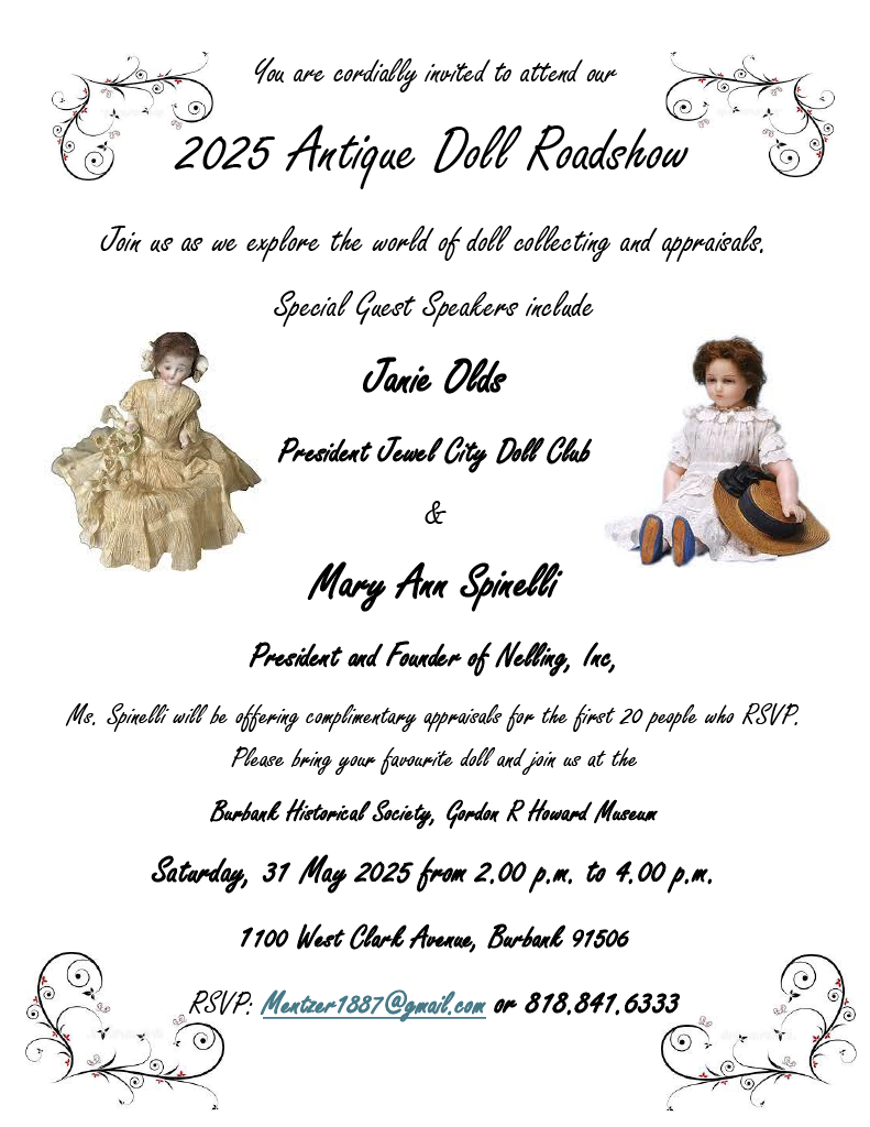 Join us at the 2025 Antique Doll Roadshow hosted by the Burbank Historical Society at the Gordon R Howard Museum!