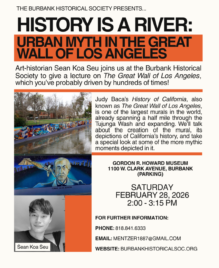 History Is A River: Urban Myth In The Great Wall of Los Angeles Saturday, February 28, 2026 2:00 PM 3:15 PM Gordon R Howard Museum 1100 West Clark Avenue Burbank, CA, 91506 United States (map) Google Calendar ICS Join the Burbank Historical Society for an engaging afternoon exploring one of Los Angeles’ most iconic public artworks. Art historian Sean Koa Seu will guide us through the powerful story behind The Great Wall of Los Angeles